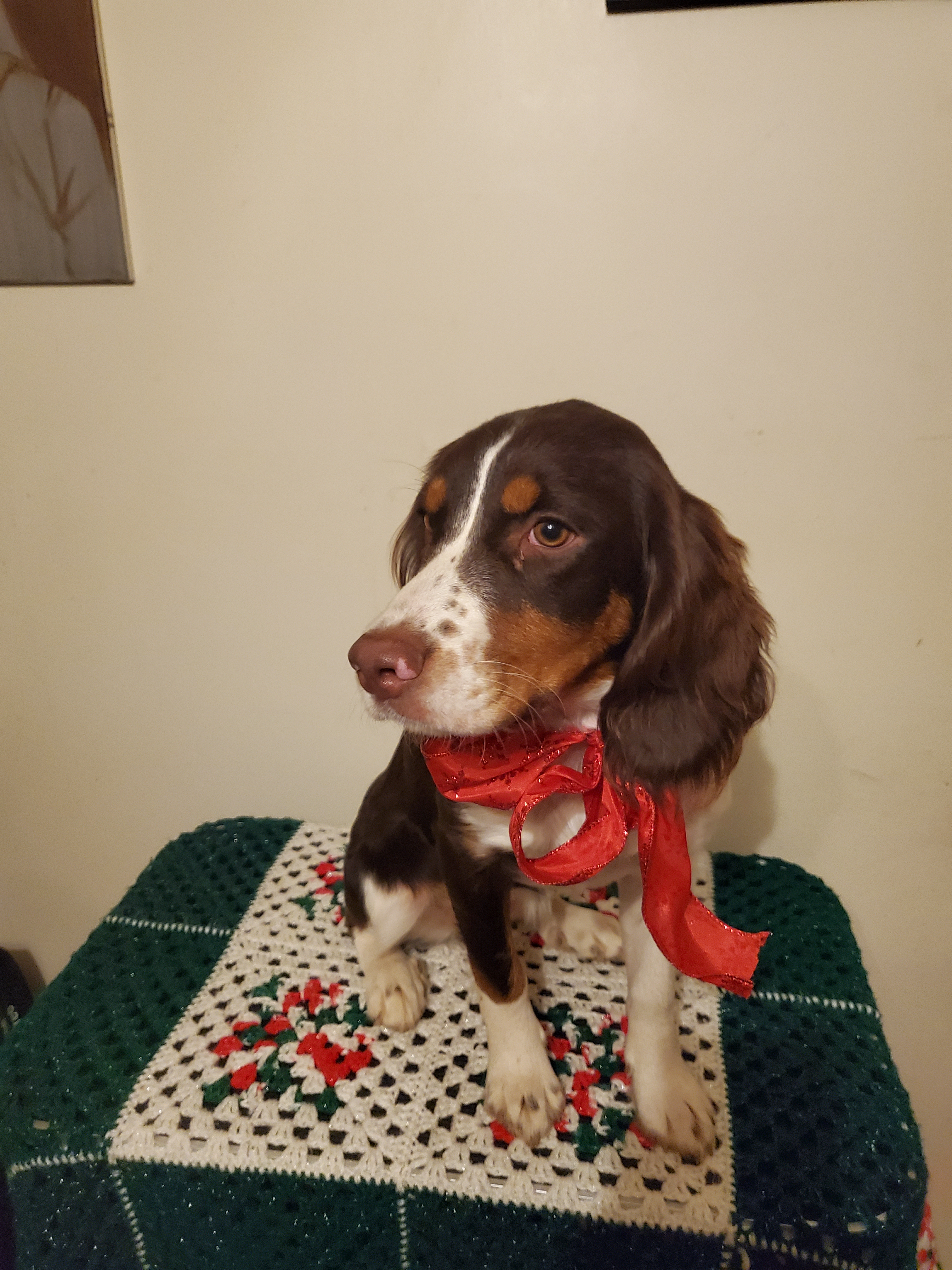 | Kimra Golden Eyes AKC # SS27632004 [Kimra] is our first Tri Color female she was born in 6/11/2021. She is a Liver, White, and Tan with a longer coat length. We picked her up from a breeder in Pennsylvania as a 8 weeks year old pup. She is beautiful and her and Squirt will have gorgeous pups. Kimra is being Embark DNA tested and OFA certified for her joints and waiting for the eye appt for that certification. Kimra plays with the other dogs well and enjoys the back yard. Like the others she thinks the place to be is beside us and will be normally be with Pam either in her recliner or bed. She rides great and is working on her leading skills. She does fetch but is not as fast as our Luna. On her last vet visit she weighed 40 lbs. |