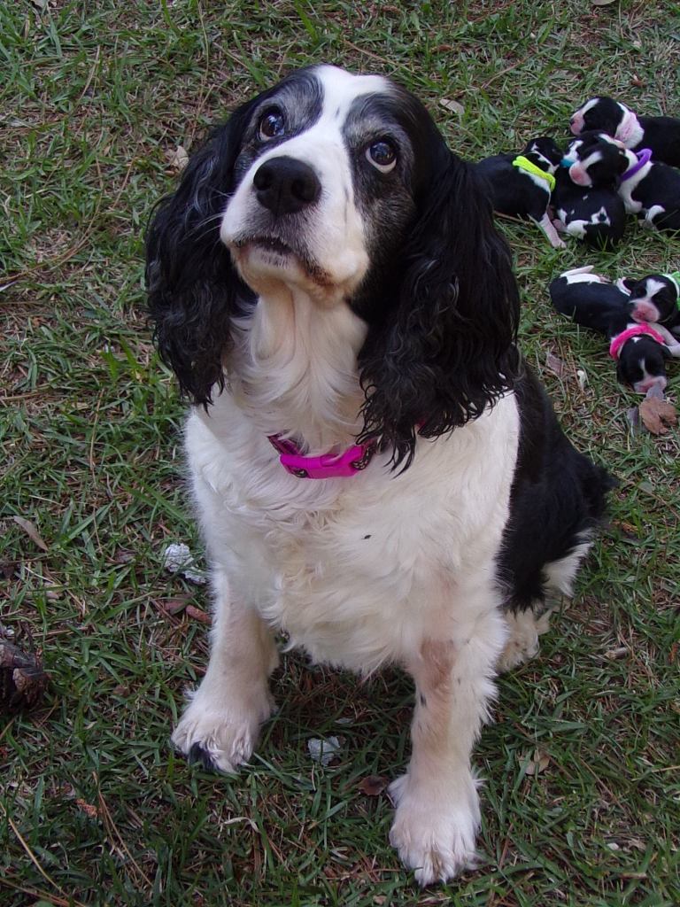 | Alexandria Carolina Joy AKC # SR48267008 [Allie] is our first female she was born in Feb. 2008. She was black and white but showing gray with her age. She enjoyed retirement and believed she was boss of the home. We got her from a kennel in Dunn, North Carolina. We purchased Allie because we wanted a Springer and not until 2 years later did we decide to start breeding. She has given us 6 litters of puppies. Being 14 and had a case of dementia she didn’t move as quickly as she use to and would get lost. Most of the day she relaxed in the bed room. She died in August of 2022. |
